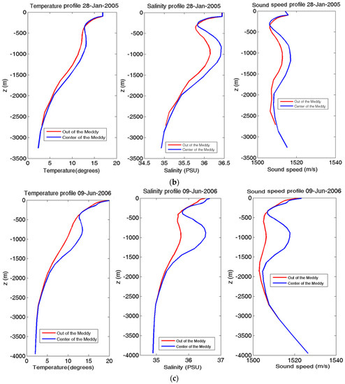 Vertical profiles of temperature (left), salinity (middle), and sound speed (right). The red line refers to the point outside the Meddy and the blue line to the Meddy core. (a) On 6 February 2004; (b) on 28 January 2005; (c) on 9 June 2006.