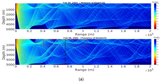 On 6 February 2004, in the control section, no acoustic signal propagated directly from the source to the receiver without reflection. An acoustic channel was observed between the surface and the 800 m depth with multiple reflections. In the section with Meddy 33, the sound signals were deflected to the surface and could not reach the bottom. The depth of the sound channel increased in comparison with the control section; the sound signals intensified, and the transmission loss decreased to 80 dB. In particular, the transmission loss decreased near the surface (upper 500 m), between 1000 to 1500 m depth, near the bottom (from 4000 m down to the bottom) and also at long range (between 195 to 200 km), (Figure 6a).