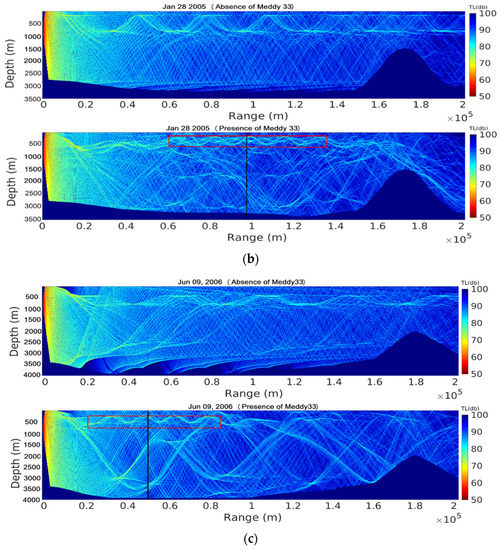 The transmission loss of sound signals in the absence of the Meddy (top picture) and the presence of the Meddy (bottom picture), with Meddy location (framed in red) (a) on 6 February 2004; (b) on 28 January 2005; (c) on 9 June 2006.