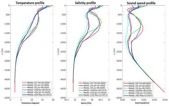 Figure 7 shows the sound speed profiles for the analyzed Meddies within their core. Compared with Meddy 33, the sound speed profiles of Meddy 120, 135 and 143 at mid-depth (between 500 to 2000 m) were lower and changed more smoothly. In Meddy 33, the minimum value of sound speed occurred at 400 m, but in other Meddies, the sound speed reached its minimum value at about 2000 m.
