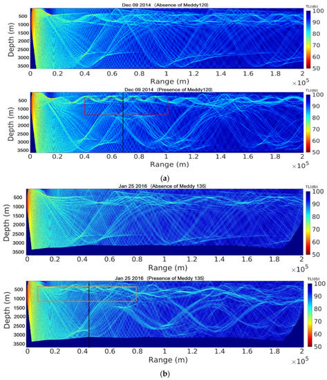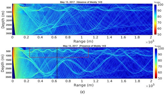 The transmission loss of sound signals in the absence of Meddy 120 (top) and in its presence (bottom), with Meddy location (framed in red) (a) on 9 December 2014; (b) on 25 January 2016; and (c) on 13 May 2017.