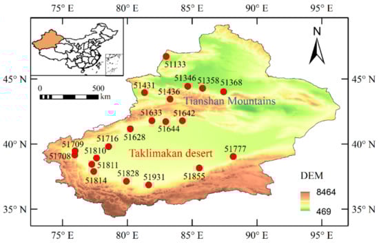 Location and elevations (m) of the selected 20 agro-meteorological sites in Xinjiang, China.