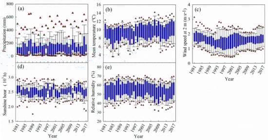 Variations of the selected climatic variables during winter wheat-growing seasons over 1981–2017 at the 20 sites of Xinjiang, China. (a) Precipitation, (b) Mean temperature, (c) Wind speed at 2 m, (d) Sunshine hour, and (e) Relative humidity. Black horizontal line: median; box-boundaries: 25th and 75th percentiles; whiskers: 10th and 90th percentiles; triangles: outliers.