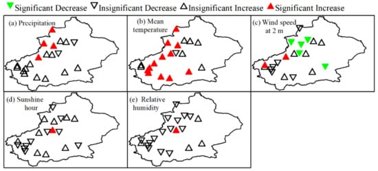 The trends and significance of the five selected climatic variables during the winter wheat-growing season over 1981–2017 are mapped for each site of Xinjiang, China in Figure 3. The increasing trends of Pre were observed at 16 stations, of which the trends of Pre at four stations (located mainly in north Xinjiang) were significant (Figure 3a). Tmean at 12 stations showed significant increasing trends (Figure 3b). A total of 11, 11 and 15 stations showed decreasing trends in U2, Sun and RH, respectively (Figure 3c–e). Only one site had significant trends in Sun and RH. These variation trends of the climatic variables would contribute to the growth and yields of winter wheat.