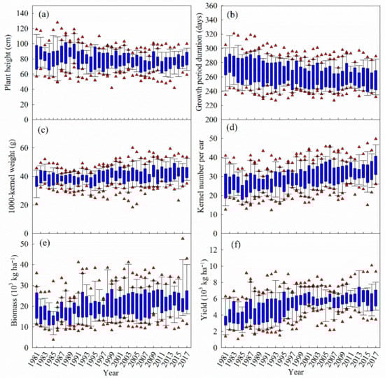 The box plots of the growth- and yield-related parameters of winter wheat over 1981–2017 at the 20 sites of Xinjiang, China. (a) Plant height of maturity stage, (b) growth period duration, (c) 1000-kernel weight, (d) kernel number per ear, (e) biomass of maturity period, and (f) yield.