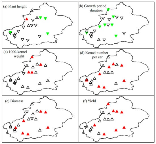 Spatial distributions of the trends and significance of the growth-related and yield-related variables of winter wheat. (a) Plant height of maturity stage, (b) growth period duration, (c) 1000-kernel weight, (d) kernel number per ear, (e) biomass of maturity period and (f) yield.