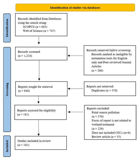 This review sought to include all searchable studies that have researched the ability of wetlands to treat runoff from urban and agricultural landscapes. The primary studies eligible for inclusion in this review needed to meet the following criteria: (1) the study performed analysis on the ability of wetlands to treat CUPs and/or antibiotics from non-point source pollution; (2) the study was from a peer-reviewed journal.