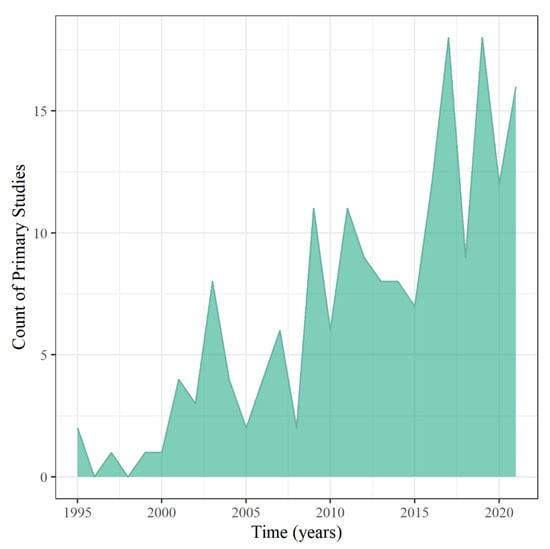 The length of the study was coded in five different categories: hours, days, weeks, months, and years (Table 4). Hours were defined as any study that took place less than 24 h. Only one study fell into this category, which evaluated removal efficiencies of permethrin in a mesocosm study with four different wetland plant species (i.e., Leersia oryzoides, Typha latifolia, Sparaganium americanum, Thalia dealbata) over 12 h [54]. The second category, days, was defined as an experiment that lasted between 1 to 7 days, which included 13% of the primary studies. The category of weeks was then defined as an experiment that was between 7 to 30 days, with months defined as an experiment that took place between 30 to 365 days, and years being an experiment that was longer than 365 days.