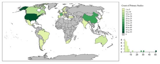 The primary studies took place throughout the world, occurring in 37 countries. Countries with the highest number of primary studies included the United States (U.S.; n = 52), China (n = 30), and France (n = 26; Figure 3). This could undoubtedly be due to the limitation of the review to English journals. However, this could also be indicative of water quality concerns and policies limiting the use of emerging contaminants in different regions of the world. For example, the U.S. has approved the use of pesticides and antibiotics (e.g., phorate, dicrotophos, tribufos, oxytetracycline, streptomycin) for outdoor agricultural use, of which many have been banned or phased out by the European Union, Brazil, and China [219]. In the U.S., the Mississippi River Basin is the largest, most intensively farmed region with phorate, dictophos, tirubfos, and oxytetracycline primarily applied to land in the Southeastern region of the United States [220]. This is represented in Figure 4, where the state of Mississippi was the location of 48% of the primary studies in the U.S. Furthermore, these studies were further analyzed based upon experimental design and implications to wetland treatment processes in the sections below.