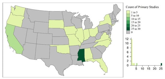 The spatial distribution of the primary studies within the continental United States (U.S.).