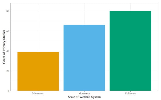 The scale and type of wetland system used for analysis within the primary studies were coded to determine the scope of the studies along with their impact on the study results to assess Objective 2. The scale has the potential to impact removal efficiencies of contaminants by increasing the number of variables in the system, moving from a controlled environment to a natural environment, and introducing artificial impacts (i.e., wall-effects in microcosm and mesocosm experiments) as studies progress from microcosm to full-scale [221,222]. Microcosm studies utilize repeatable small-scale systems to understand a specific biogeochemical process (e.g., sorption, phytoremediation, microbial activity) in a controlled environment [222,223]. On the other hand, full-scale systems include major processes in the natural environment; however, these studies are harder to replicate due to land and cost constraints [221]. Mesocosm studies are a more cost-effective tool to study contaminant removal in wetlands compared to a full-scale system, while still providing useful predictions using treatment replicates and controls to study wetland efficacy in controlled and natural environments [221,224]. As for the primary studies, 43% studied full-scale systems, 37% studied mesocosms, and 21% studied microcosms (Figure 5), with only two studies investigating more than one scale [53,76].