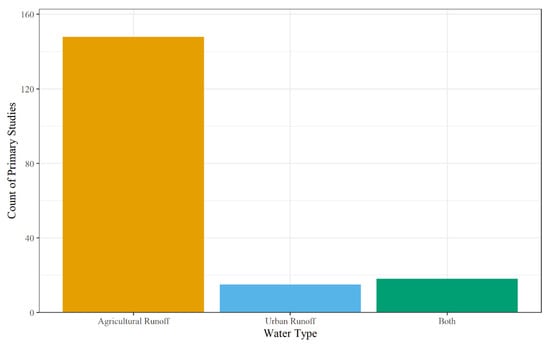 The runoff from landscapes defined the water type and included agricultural runoff, urban runoff, both agriculture and urban runoff, or nature reserve. This was coded based on land cover in the watershed for field-scale systems. For mesocosm and microcosm experiments, the primary study either stated where the water was collected from, or the type and concentration of contaminants used for synthetic water. For example, Birch et al. (2004) studied a wetland located in an urban watershed in Sydney, Australia to determine the removal efficiencies of organochlorine pesticides, polycyclic aromatic hydrocarbons, trace metals, nitrogen, phosphorous, and stormwater effluent [213]. On the other hand, Butkovskyi et al. (2021) used synthetic wastewater to simulate agricultural runoff by applying tap water, fertilizer solution, and different types of pesticides (bentazone, MCPA, metalaxyl, propiconazole, pencycuron, imidacloprid) to potted microcosms containing Phalaris arundinacea sp. Larsa [181]. For the primary studies, the most common water type was from agricultural runoff (n = 148), with both agriculture and urban runoff encompassing 18 studies, and urban runoff alone assessed in 15 studies (Figure 6). Studies investigating urban and agricultural runoff were either not specific about the water type and instead reported contaminant(s) applied in upstream regions (e.g., sulfonamides used to treat both human and animal infections [76,90,170], or the field site for the primary studies’ watershed contained both urban and agricultural runoff [74,80]. Finally, nature reserve was the least studied landscape (n = 1); Tsui et al. (2008) assessed glyphosate concentrations in the Mia Po Nature Reserve in Hong Kong [87].