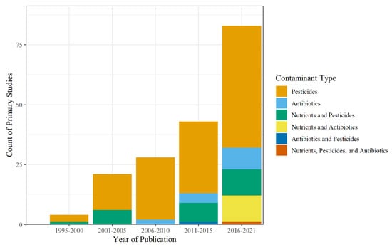 Seven different types of contaminants were studied: nutrients, pesticides, antibiotics, other pharmaceuticals besides antibiotics, metals, minerals, and industrial by-products (Table S1). Pesticides included herbicides, insecticides, and fungicides and were the most common type of contaminant analyzed, appearing 556 times throughout the primary studies with peak study counts occurring between 2016 and 2021 (Figure 7). The most common pesticides studied were atrazine (n = 25), chlorpyrifos (n = 22), s-metolachlor (n = 21), alachlor (n = 16), and isoproturon (n = 14), along with 158 other pesticides analyzed. Atrazine is a commonly used herbicide, introduced in 1985, and is mainly used for agricultural landscapes while also being used on residential lawns and golf courses, particularly in the Southeastern United States [228]. Additionally, chlorpyrifos, an insecticide introduced in 1965, and s-metolachlor, an herbicide introduced in 1976, are used for agricultural and non-agricultural landscapes, while alachlor and isoproturon are herbicides mainly used for agriculture.