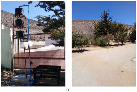 Greywater reuse system and irrigation area of Los Pozos (a) and José Santos Ossa school (b). The photographs on the right correspond to the area irrigated with treated greywater.