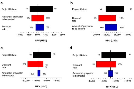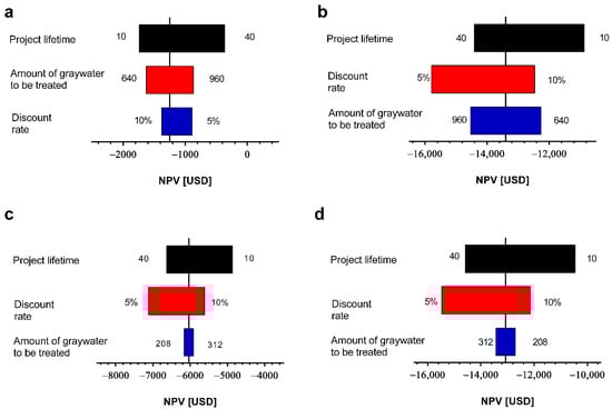 From the analysis shown in Figure 2, it is observed that the modification of the analyzed variables does not generate economic feasibility scenarios (NPV > 0). This is explained because the costs of each project are very high and are not amortized by the economic benefits of each project. For this reason, it is necessary to consider a state subsidy that favors an improvement in the cost-benefit ratio of the projects. To evaluate this, a sensitivity analysis was carried out considering the state subsidy previously used in Section 3.1 (3685 USD) and as a contribution to the capital costs of each project. With this potential state subsidy, it is observed that again the project lifetime was the most relevant variable for both scenarios and both schools. It is observed that with this subsidy the Jose Santos Ossa school in scenario 1 (light greywater) reaches an NPV close to 0 when it was evaluated at 40 years (Figure 3a). However, again an inverse behavior is observed for scenario 2 (light and dark greywater) (Figure 3b), which occurs because when treating dark greywater the operation and maintenance costs are higher. This is also observed for Los Pozos school in both scenarios (light and light and dark greywater) (Figure 3c,d).