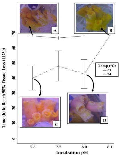 To determine if invasive TC inhabiting the Gulf of Mexico are more resistant to stress than wild congeners from the Indo Pacific (TCP), we compared temperature and pH sensitivities over 72 h (Figure 2). Sampling every 4 h showed significant (p < 0.000) differences experienced for TC between temperatures 31 °C and 34 °C at pH 7.5 and pH 8.1 (Figure 2). However, fewer differences were observed for TCP (wild congeners) at pH 7.5 at 31 °C and 34 °C between hours 0 and 36 and hours 0 to 20 at pH 8.1 at 31 °C and 34 °C. A full factorial negative binomial glm model (L50 = Species*Temperature*pH) was used to explain the variance in the data (theta = 31.0122; AIC = 199.78). Overall, the mean number of hours required to reach 50% tissue loss (LD50) for TCP was less than TC by a factor of 0.45 (p < 0.000). At the expected pH for tropical reef habitats (pH 8.1), the LD50 decreased with increasing temperature (Figure 2). Consistent with this trend, increasing temperature from 31 °C to 34 °C was found to be a significant main effect (p = 0.004) decreasing the LD50 by a factor of 0.58.