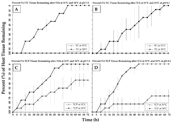Coral bleaching as determined by the time (h) required to reach 50% tissue loss of invasive and wild Tubastraea coccinea to pH and temperature. “TC” represents the invasive T. coccinea, while “TCP” represents the wild Indo-Pacific congener. Percent (%) of host tissue remaining on the y-axis is in 10% divisions; time (h) on the x-axis ranges from 0–72 h in 4 h divisions. Error bars indicate 95% CI. Some error bars are too small to observe. (A) Percent (%) TC tissue remaining after 72 h at 31 °C and 34 °C at pH 7.5. (B) Percent (%) TC tissue remaining after 72 h at 31 °C and 34 °C at pH 8.1. (C) Percent (%) TCP tissue remaining after 72 h at 31 °C and 34 °C at pH 7.5. (D) Percent (%) TCP tissue remaining after 72 h at 31 °C and 34 °C at pH 8.1.