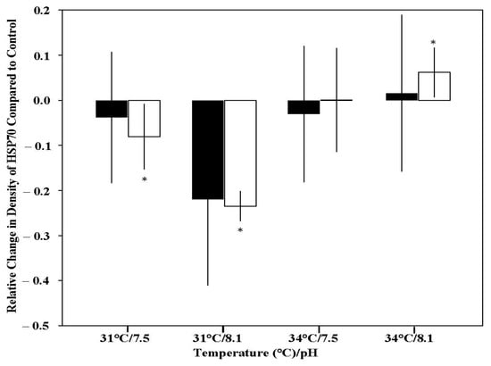 Relative change in density of expression of heat shock protein 70 (HSP70) from our 0-h control in Tubastraea coccinea. Treatment conditions are grouped by temperature (31 °C or 34 °C) and pH (7.5 or 8.1). Samples were run in duplicate. Black bars represent TC (the invasive T. coccinea); white bars represent TCP (the wild Indo-Pacific congener). Error bars indicate 95% CI. Significant values comparing temperature and pH are as follows: * ≤ 0.05.