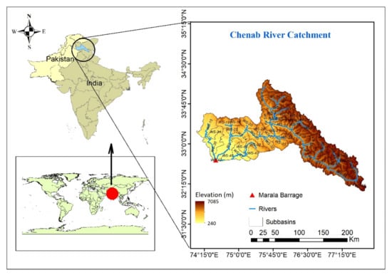 The Chenab river catchment is shown in Figure 1. The geographic extent of the Chenab river catchment lies 74°–77.85° E and 32°–34.3° N, while elevation ranges from 240 to 7085 m, and average slope of the river in the catchment is about 25 m/km. It originates in the Kangra and Kulu district of the Himachal Pradesh, India. The Bhaga and Chandra streams emerge from mega snowfields on opposing sides of the Baralcha pass and join the Tandi, Jammu and Kashmir. The climate in the catchment typically comprises two seasons in a year. The Rabi season spans from November to April, the Kharif from May to October. Another climate classification also exists consisting of four seasons, Fall (September, October, November), Winter (December, January, February), Spring (March, April, May), and Summer (June, July, August). The snow-dominant Chenab river catchment [88] receives 65% of precipitation in the monsoon (June, July, August) or pre-monsoon (March, April, May), while 26% precipitation is received in the winter season [101]. The higher altitude of the upper and middle parts of the Chenab river catchment are snow-dominant regions. The mean annual rainfall varies from 278.5 to 2214.9 mm as shown in Figure 2.