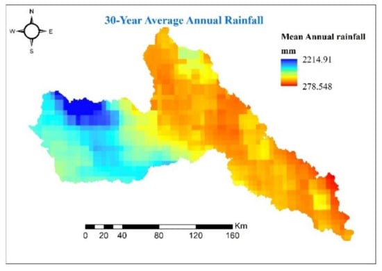 Without soil surface protection, the rainfall erosivity factor (R) triggers sheet and rill erosion. Soil loss significantly depends on rainfall because it detaches soil particles from the ground surface and transports them to the river channel [111]. Heavy rainfall events having large droplets size can quickly detach soil particles, compared to droplets of smaller size. The bulk of sheet or rill erosion occurs due to the high runoff generated by a heavy rainfall storm. Rainfall has a significant effect on soil erosion due to the kinetic energy that each raindrop contains, which causes soil particles to detach from the ground surface. We used monthly CHIRPS data for 30 consecutive years (1991–2020) over the Chenab river catchment. In order to estimate the rainfall-runoff erosivity factor of the Chenab river catchment, we calculated R-factor by using Equation (2) developed by Jung et al. [112].