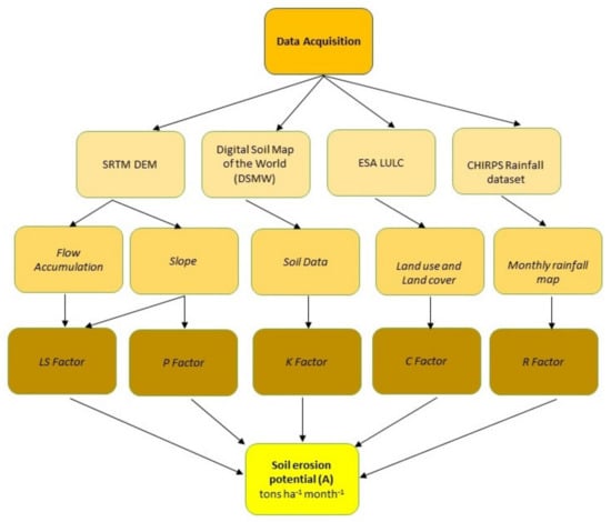 - Maqsoom, A.; Aslam, B.; Hassan, U.; Kazmi, Z.A.; Sodangi, M.; Tufail, R.F.; Farooq, D. Geospatial Assessment of Soil Erosion Intensity and Sediment Yield Using the Revised Universal Soil Loss Equation (RUSLE) Model. ISPRS Int. J. Geo-Inf. 2020, 9, 356. [Google Scholar] [CrossRef]