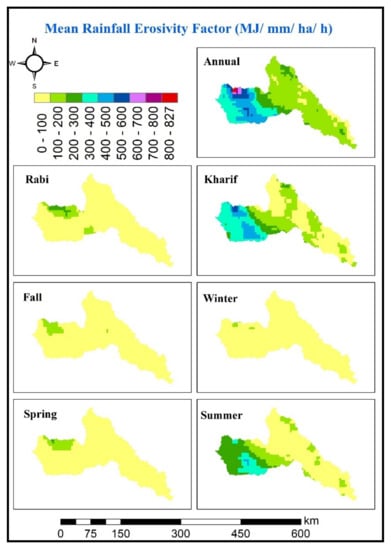 The peak rainfall erosivity factor was 826.8, 277.9, 558.5, 199, 115.3, 217.7, and 426.8 MJ mm−1 ha−1 h−1 for annual, rabi, kharif, fall, winter, spring, and summer, respectively. The spatial distribution of all the maps in Figure 4 reveals that the upper parts of the catchment have lower rainfall erosivity, and the lower parts of the catchment have very high erosivity because of high rainfall over the lower part as shown in Figure 2. Higher rainfall erosivity has been observed in kharif season (May to October), and in summer season. The maps of rabi season (November to April), fall, winter and spring seasons reveal that higher erosivity has been observed in higher latitudes in the lower parts of the catchments.