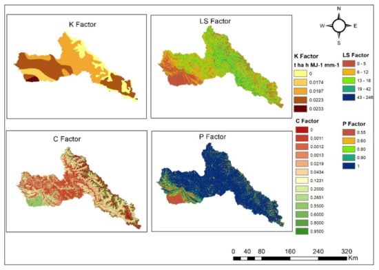 The 30-year average soil erodibility, slope-length and slope-steepness, cover management, and supporting conservation practice factors map of the Chenab river catchment is presented in Figure 5. The map of K factor reveals that most of the catchment is below 0.0197, while some portions of the catchment are in areas of high soil erodibility (greater than 0.0197).