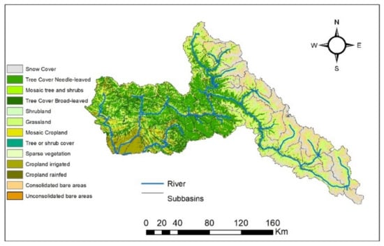 The LS factor map of the Chenab river catchment is presented in Figure 5, which reveals that most of the catchment lies under two main classes, 0 to 5 in upper and middle parts of the catchment, and 13 to 18 in lower parts of the catchment. Therefore, the effect of LS on the PSE is not higher, as a higher LS factor area is not common in the catchment. The land use map of Chenab river catchment prepared using land use data of ESA is presented in Figure 6. The upper parts of the river catchment are covered with snow, consolidated bare land, grassland, and mosaic trees and shrubs. The middle to lower parts of the catchment are covered with tree cover and mosaic cropland, while the lowest parts of the catchment near to the outlet are covered with irrigated cropland. The cover management factor values were estimated (Table 2) using the land use information of ESA.