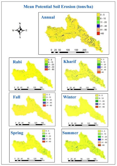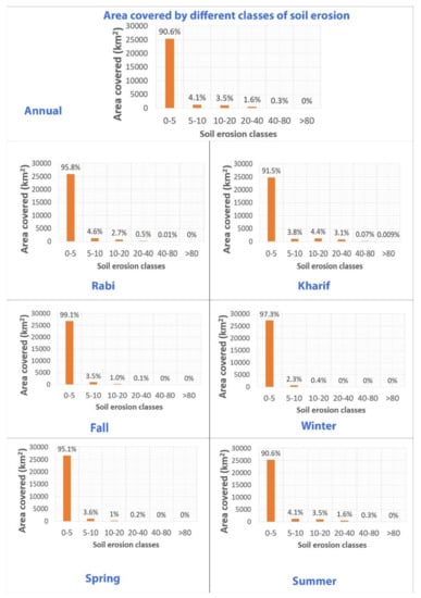 These six classes have value ranges from 0–5, 5–10, 10–20, 20–40, 40–80, and >80 tons/ha, respectively. On an annual time-scale, most PSE is under slight intensity, while areas are also under moderate, high, and very high, but the percentage of area in these three intensity classes is less. In the kharif season, there is more area in high and very high intensity classes as compared to the rabi season. In the summer season, there is area under very high intensity of erosion as compared to fall, winter, and spring season. It is obvious from Figure 8 that the percentage of area in 0–5 class is more than 90% for all the time periods.