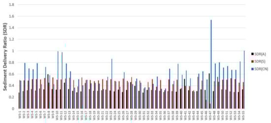 In the area-based SDR, watershed (WS)-47 exhibited the highest SDR of 0.61 having a 0.5 sq. mile area, which contributes 0.0045% of the total area of the catchment, while the WS-1 had the minimum SDR of 0.281 consisting of 565.8 sq. miles area which contributes 5.2% of the total area of the catchment/watershed. In the slope-based SDR, the WS-44 exhibited the highest SDR of 0.551 having a 270.118 sq. miles area which contributes 2.48% of the total area of the watershed, while the WS-47 had the minimum SDR of 0.08 consisting of a 0.5 sq. mile area which contributes 0.0045% of the total area of the watershed. In the CN-based SDR, the overall ratio seemed high as compared to area and slope module, in which WS-47 contributed the highest SDR of 1.53 having a 0.5 sq. mile area which contributes 0.0045% of the total area of the watershed. On the other hand, the WS-43 had the minimum SDR consisting of 265.98 sq. miles area which contributes 2.44% of the total area of the watershed.