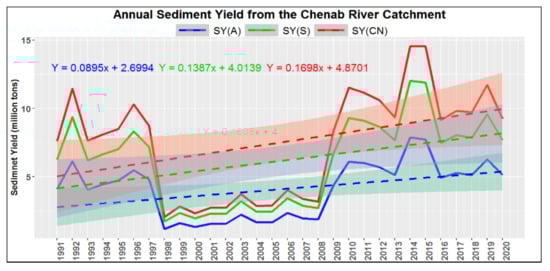 Annual sediment yield from the Chenab river catchment 1991 to 2020.