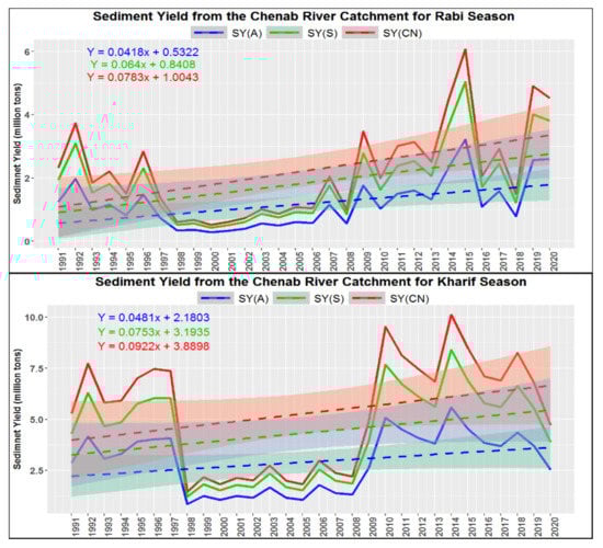 The overall contribution of the kharif season was higher than that of the rabi season. In 2014, the highest SY of the kharif season based on area, slope, and CN was 5,574,869, 8,405,752, and 10,124,635 tons, respectively. In 2015, the highest SY of the rabi season based on area, slope, and CN was 3,264,869, 5,015,752, and 8,104,635 tons, respectively. The SY time series trends analysis of the rabi season indicated an increase of 0.0418, 0.064, and 0.0783 million tons per year for area, slope, and CN-based approaches, respectively. The SY time series trends analysis of the kharif season indicated an increase of 0.0481, 0.0753, and 0.0922 million tons per year for area, slope, and CN-based approaches, respectively.