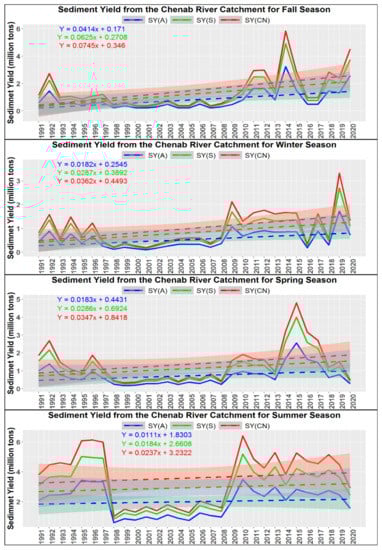 Sediment yield from the Chenab river catchment for fall, winter, spring, and summer seasons from 1991–2020.