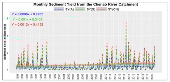 The monthly sediment yield for the last 30 years is presented in Figure 14. The highest SY values of 3,125,536 tons, 4,745,077 tons, and 5,643,741 tons for area, slope, and CN, respectively, were observed in September 2014. Similarly, the lowest values of 11,484 tons, 17,904, and 21,811 tons for area, slope, and CN, respectively, were observed in November 1998. The time series trends analysis of SY indicated an increase of 0.0006, 0.001, and 0.0012 million tons per month for area, slope, and CN-based approaches, respectively.