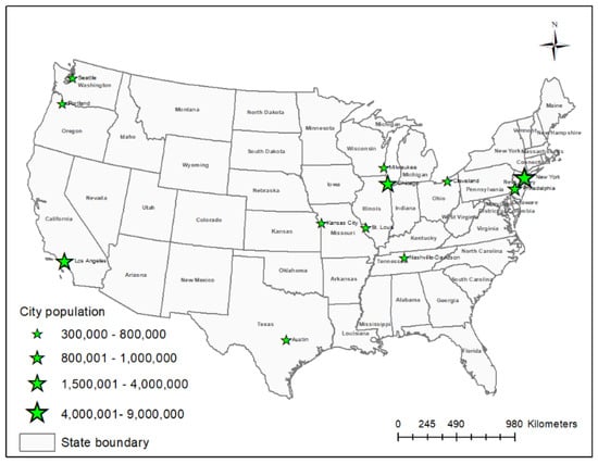 This study was driven by the needs of a stakeholder who was interested in GI planning and programs from United States metro areas of the size (i.e., population-based) of the City of St. Louis, Missouri, with the objective to understand the short-term and long-term returns of incorporating GI practices in city planning. The population of St. Louis was used as a selection criterion of the cities examined in this study. St. Louis is approximately 21,900 km2 and home to 320,000 inhabitants according to the 2010 United States Census data [26]. The St. Louis Metropolitan Sewer District (MSD) is the nation’s fourth largest sewer system, covering 525 square miles with 9600 square miles of sanitation and stormwater systems. Sixteen metro areas with GI adoption programs were selected for the study (Table 1). The cities were selected such that all the major cities in United States are somehow represented. An additional five cities were selected from outside the United States to gain a worldwide perspective.