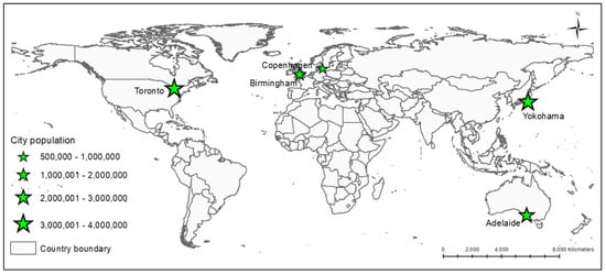 The metro population served by the 16 GI adoption plans reviewed in this study range from 1.5 million (Milwaukee Metropolitan Area) to 35 million (Greater Tokyo Area) inhabitants, with land areas covering 3000 km2 for Copenhagen to 1,200,000 km2 for Adelaide (Table 1, Figure 1 and Figure 2). The population data were based on the information available during the time of this study, indicating that changes in the population size at publication of this document may not be herein reflected.
