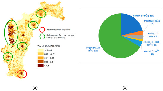 Water demand spatial distribution in São Francisco River basin in 2018 (a); and sectorial water demand (b).