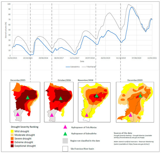 The dams and reservoirs are vulnerable to extreme drought events in the basin. The recurrence of low rainfall patterns has contributed to water scarcity problems in the catchment area, and as a consequence, the water level at the reservoirs dropped to 10% of the capacity. Data collected from the Brazilian Drought Monitor and the Brazilian Reservoir Monitoring System demonstrate such effects of the lower rainfall values in Sobradinho and Três Marias hydropower plants located in the São Francisco River. The Drought Monitor is a systematic monitoring process of the drought severity in Brazil. All the data are available in a spatial platform and the classification of the severity of the drought is adapted from the categorization of the National Drought Mitigation Center, Lincoln, NE, USA. Figure 4 shows reduced values of water stored in these two dams, especially during 2015, 2016 and 2017, when the region suffered from problems related to drought, as demonstrated by the drought severity maps of the Drought Monitor.
