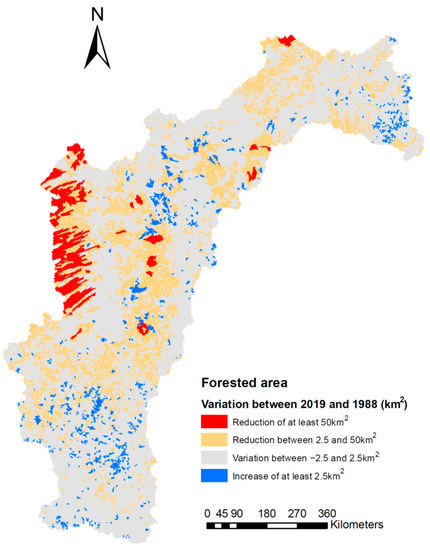 The Figure 10 depicts the spatial distribution of the green infrastructure variation. In terms of green infrastructure, there is a net loss during the period between 1988 and 2019. The alteration of the land use and land cover reveals an overall decreasing of the forested area, with a reduction around 5.5 million kilometres square of the green infrastructure from 1988 until 2019. Aggressive land conversion, intensive agricultural practices, and grazing explains the increase in the water security threats, particularly in the western part of the basin.