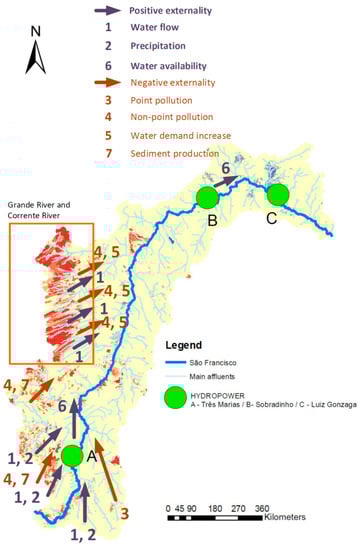 The paper analysed the spatial externality through the connectivity assessment of the drivers in the river basin. In São Francisco River basin, upstream positive externalities, like water flow, water availability and precipitation, generate benefits for downstream. On the other hand, negative impacts related with point and non-point pollution, sediment production and water demand increase, impact not only locally but can probably produce negative externalities in the downstream (Figure 11).