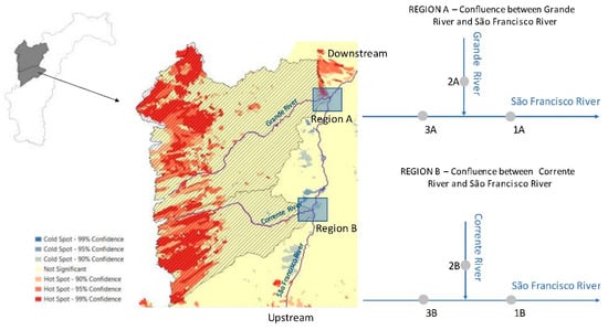 As can be noted in Figure 11, the water security threat has increased in upper Grande and Corrente river basins related with the land use modification during the last decades. A Mann–Kendall test is applied to identify the possible impacts of these changes in the water quality conditions in 2 regions (A and B), and 3 monitoring points were selected for each region, as shown in the Figure 12.