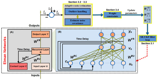 In this section, the proposed SR-UKF algorithm in parameter estimation for the Elman neural network will be described. First, an overall view of the proposed SR-UKF algorithm is given in Section 3.1; The other subsections provide more details about the adaptive noise estimation, weight constraint and handling outliers, which are the important components of the proposed SR-UKF algorithm (Figure 1).