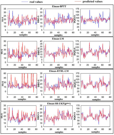 The above results show that the Elman-SR-UKF can create more accurate and robust results, thus overcoming the underprediction phenomena in data-driven process monitoring [44]. Although the main principle of this paper is different from the reference [44], it is very easy to extend this study to the quantify the uncertainty of effluent variables forecasting. Compared with the application of Li et al. [45,46], this paper provides a better prediction performance and a simple sequential way to update the parameters online. Thus, this study can be successfully envisioned to be applied to process monitoring of effluent variables in wastewater plants.
