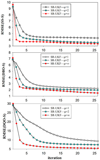 Even though UKF works well, two shortcomings of the UKF need to be addressed. First, in iterative learning, the generation of sigma points needs to calculate the square root of the matrix in Equation (2). Second, due to the random error and calculation accuracy, the positive definite nature and symmetry of the state error covariance may be broken down, resulting in divergence of the algorithm. To address these problems, this study makes full use of the numerically effective square root form of UKF, namely SR-UKF [24]. SR-UKF introduces three powerful linear algebra techniques: QR decomposition, Cholesky factor updating, and effective least squares. QR decomposition algorithm and Cholesky factor updating algorithm. These improvements can effectively avoid the ill square root operation of the error covariance and the negative effect of least squares (right division operator “/” in MATLAB), and then avoid the matrix inverse operation during the calculation.