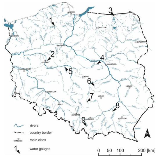 - Jokiel, P.; Tomalski, P. Transformations of hydrological seasons configuration along the Vistula and the Oder river. Monogr. Kom. Gospod. Wodnej Pan 2019, 42, 21–33. (In Polish) [Google Scholar]