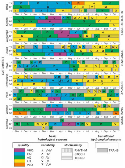 | No. | Catchment | Number of Days of Transitional Hydrological Season During a Year (Percentage) | Critical Length of Basic Hydrological Season (Days) | Number of Identified Basic Hydrological Seasons | ||||||