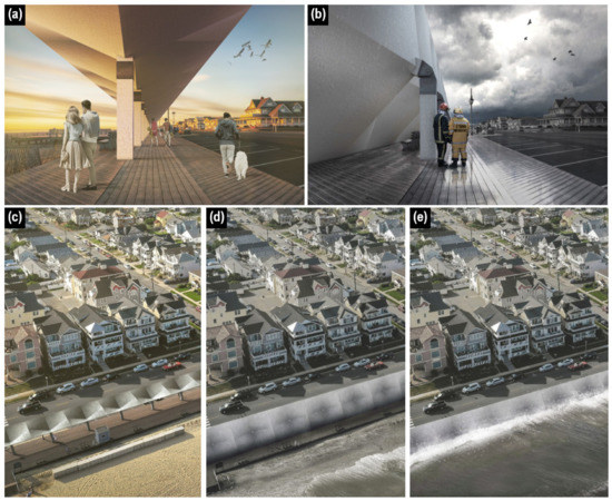 Architectural rendering of kinetic umbrellas in the (a) upright and (b) deployed position; aerial view of umbrella system in the (c) upright position, and when deployed (d) prior to and (e) during a storm surge event also shown. Images courtesy of FotosForTheFuture/Shutterstock.com with modifications by Mauricio Loyola.