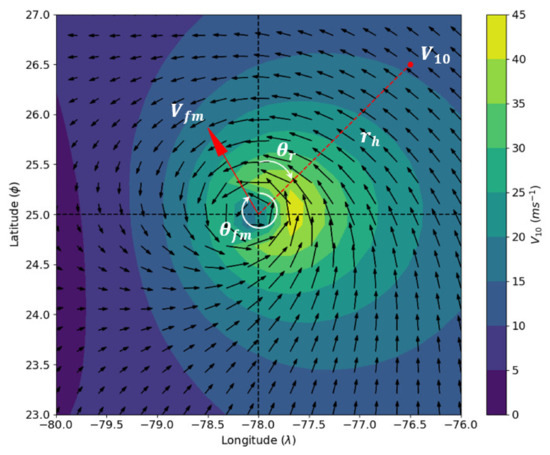 where is the latitude of the hurricane center and is the pressure deficit in hectopascals (with = 1013.25 hPa). In addition to the gradient winds, the forward speed () and direction of translation of the hurricane relative to the point of interest is considered. When assuming a constant inflow angle of 25° of the radial flow [39], the near-surface winds at radius is approximated as follows: