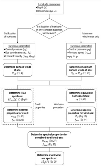 Flowchart summarizing the parametric model for the determination of combined shallow water swell/wind-sea spectra associated with hurricanes.