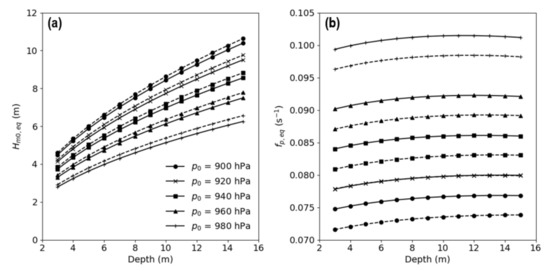 (a) Significant wave height and (b) peak frequency of maximum combined swell/wind-sea hurricane waves at various shallow depths and eye pressures determined via the parametric model for = 5 ms−1 (solid line) and = 10 ms−1 (dashed line).